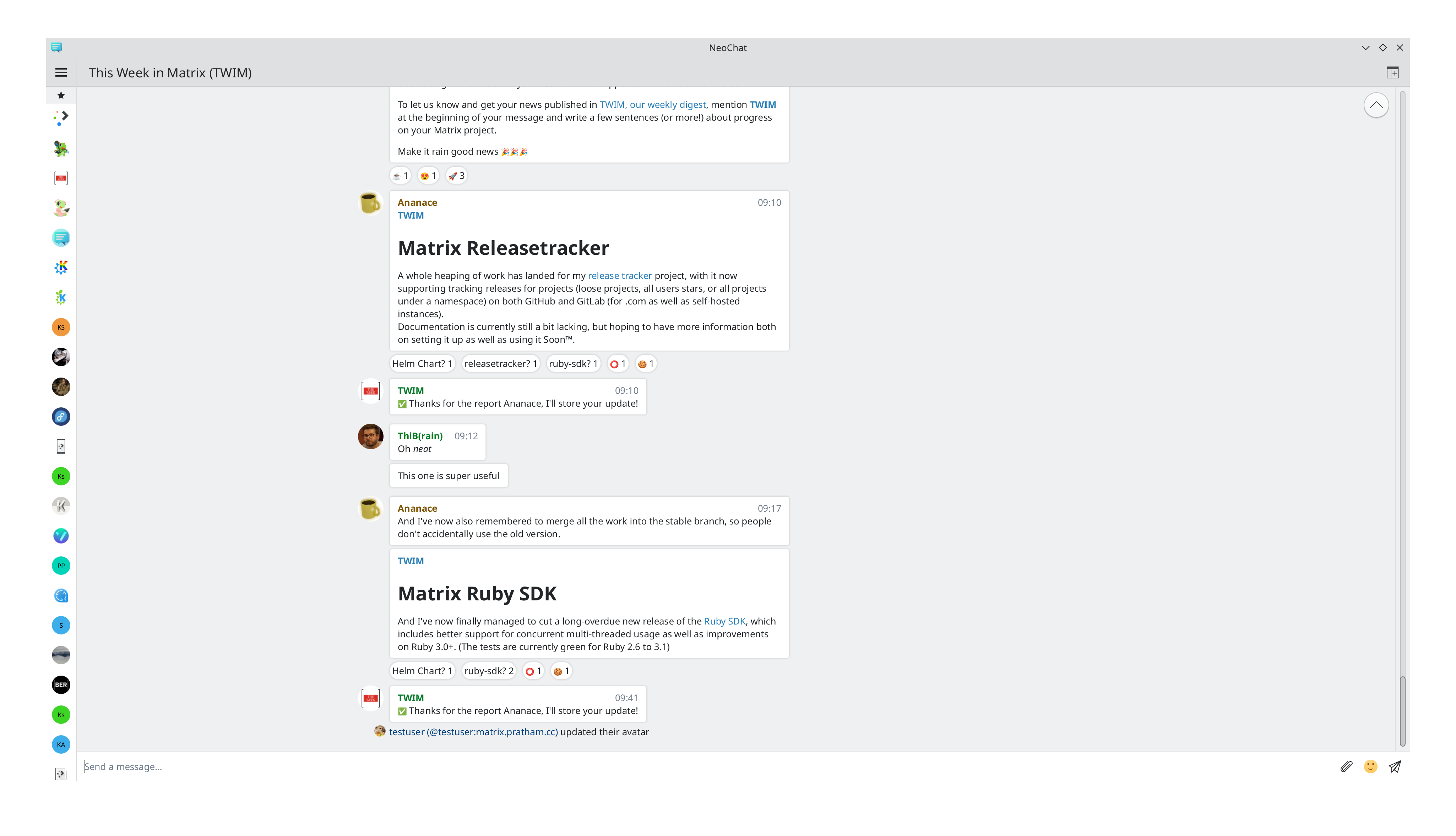 - We're also moving forward on the E2EE support, with NeoChat now allowing a user to send an encrypted message into a matrix room - provided libQuotient supports it ๐