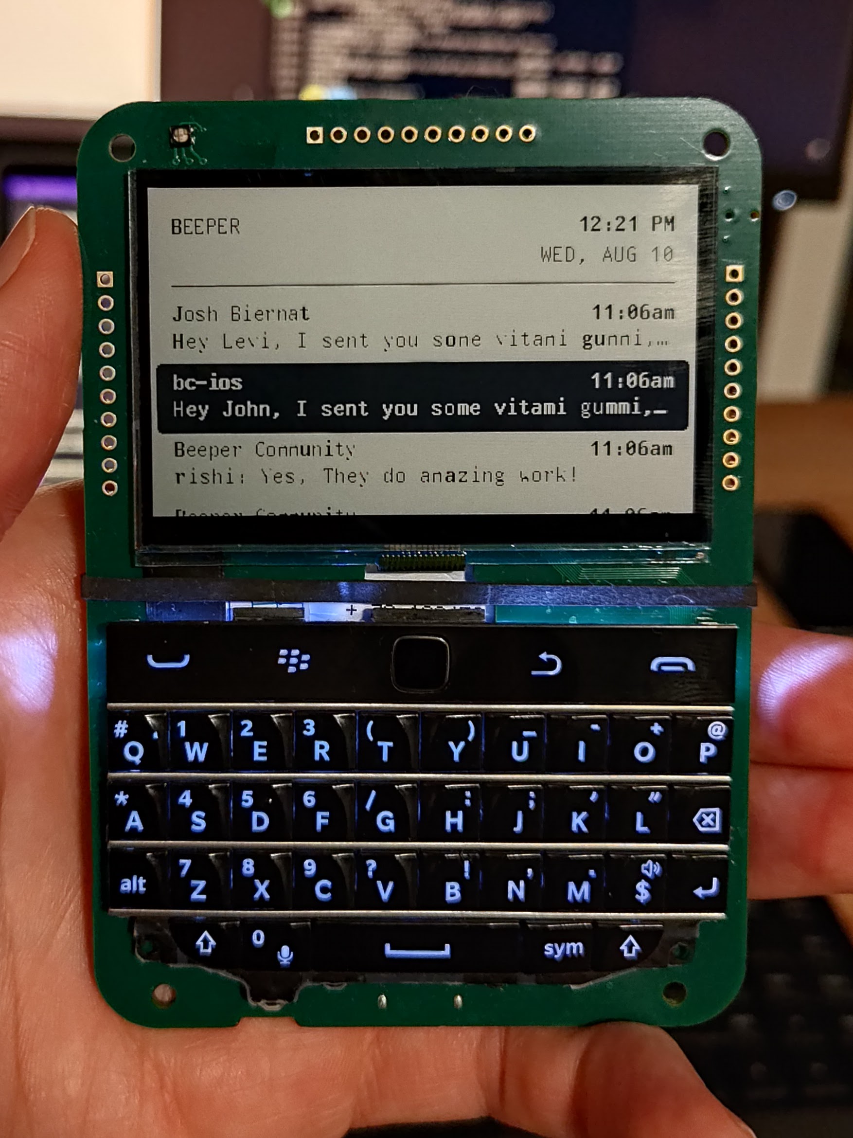 Oh and as a fun side project we are building a real Beeper beeper. It might be the very first dedicated Matrix device? It’s basically a Blackberry for Matrix, with an e-paper display (same tech as Pebble) πŸ™‚Β https://twitter.com/ericmigi/status/1558137599893524480 If you are a hacker who wants to build something with it, I have a few extra that I might be able to give out. Send me a message with a convincing argument πŸ˜‰