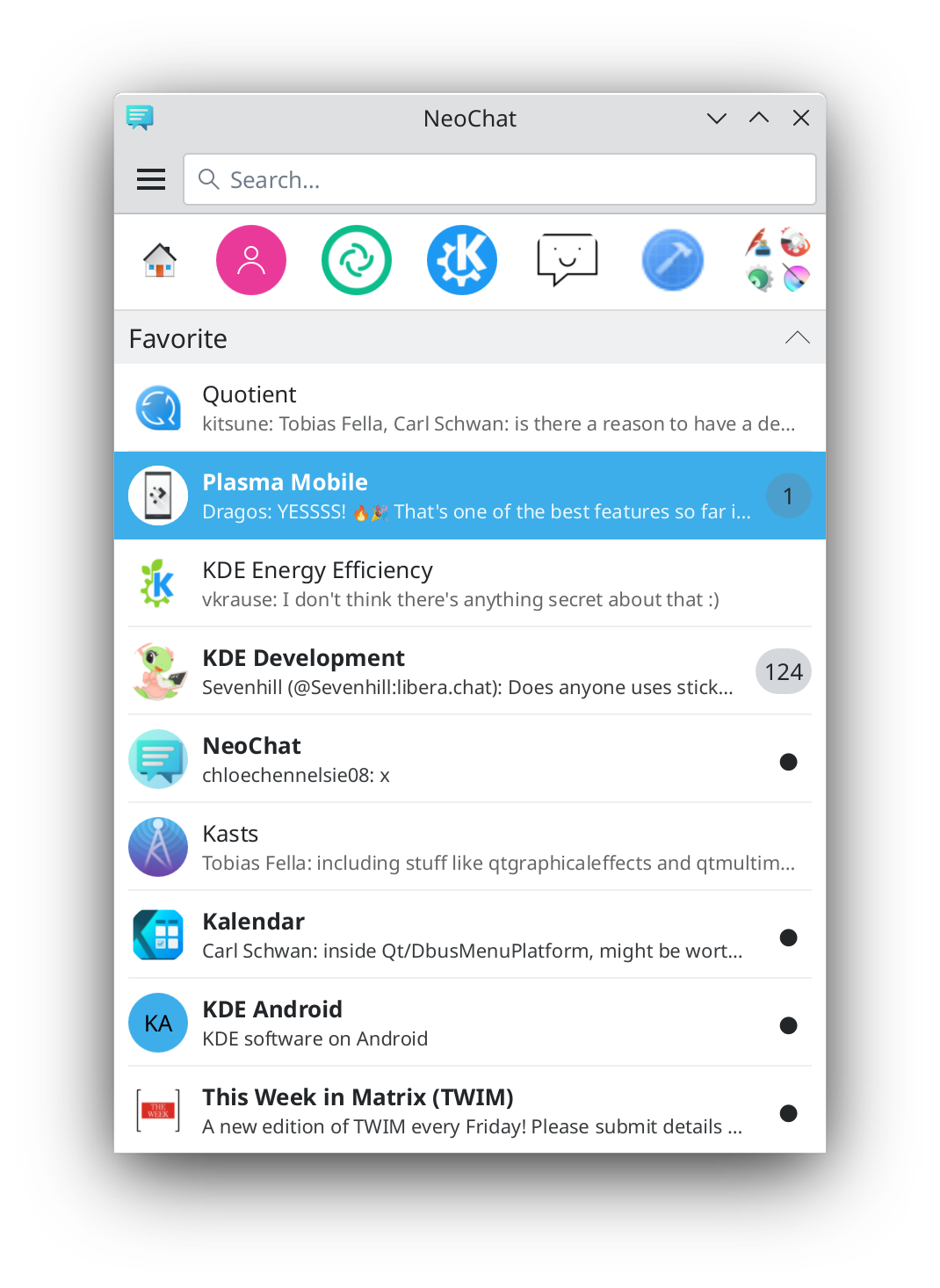 • Thanks to the GSoC work by Snehit, NeoChat now has some support for spaces: at the top of the room list, you can select a space to make the room list only show rooms of that space