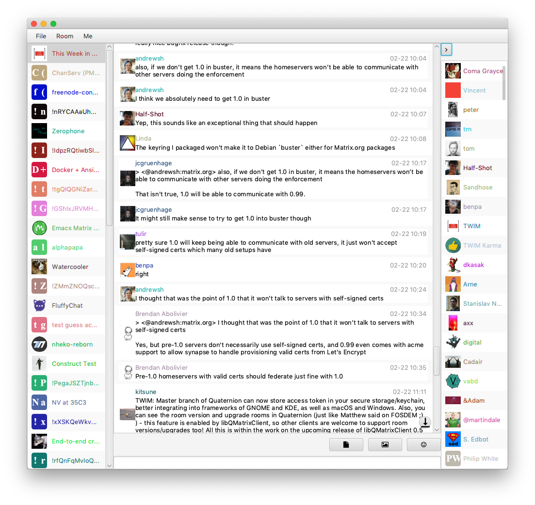 Master branch of Quaternion can now store access token in your secure storage/keychain, better integrating into frameworks of GNOME and KDE, as well as macOS and Windows. Also, you can see the room version and upgrade rooms in Quaternion (just like Matthew said on FOSDEM ;) ) - this feature is enabled by libQMatrixClient, so other clients are welcome to support room versions/upgrades too!